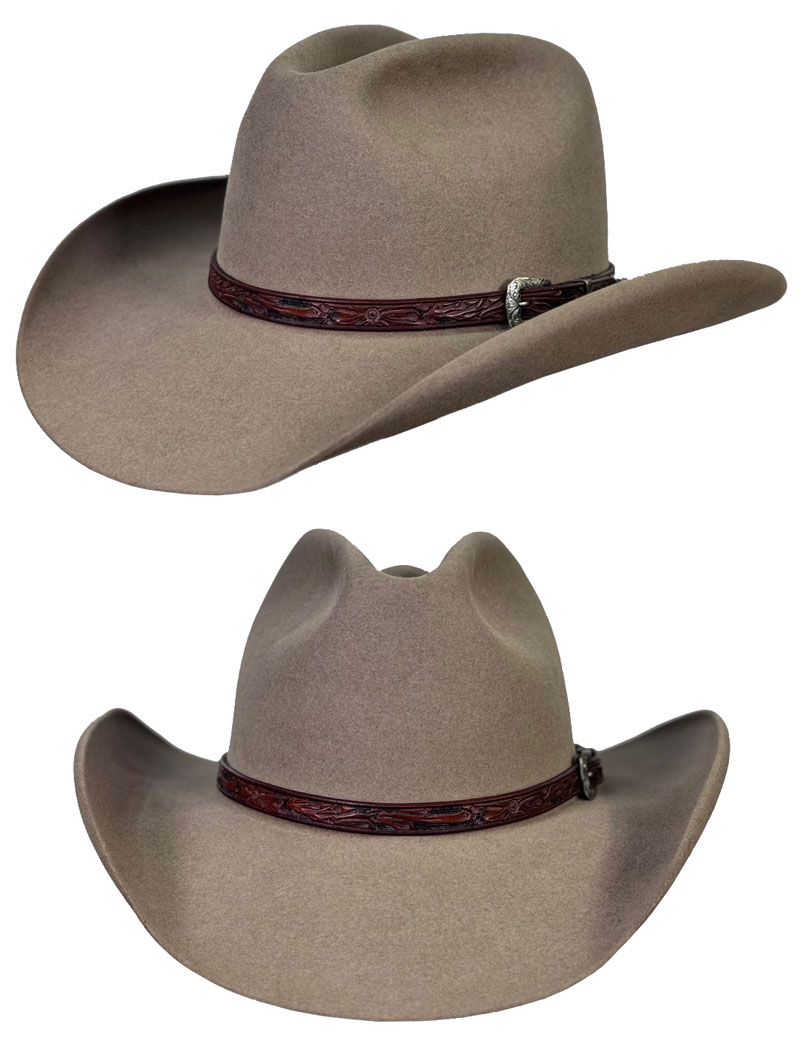 | Hat Band | 1/2" hand-tooled 2 tone leather, 1/2" Susan Buckle |
